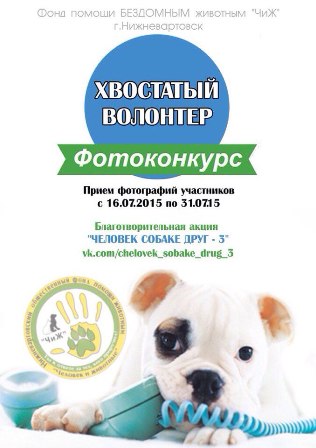 3. Объявление победителей фотоконкурса состоится 16 августа 2015 (в 10.00) в группе фотоконкурса и в основной группе Фонда http://vk.com/chizh_nv, а на Благотворительной акции "ЧЕЛОВЕК СОБАКЕ ДРУГ-3" на Площади Нефтяников (с 15.00 до 18.00, во время мероприятия) состоится награждение победителей!