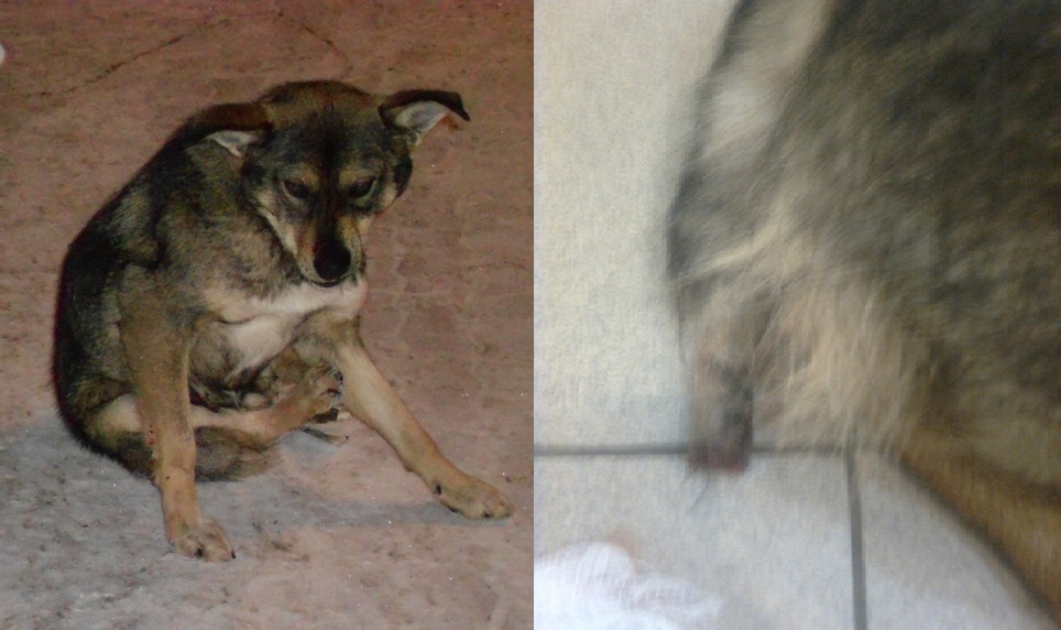 В этот же вечер была организована поимка собачки. На месте выявилось, что у нее не просто отсутствует большая часть хвоста, но и присутствуют нитки. Видимо, кто-то пытался ей зашить поврежденный хвост. Но на морозе нитки не схватились, рана начала кровить и гноиться.
